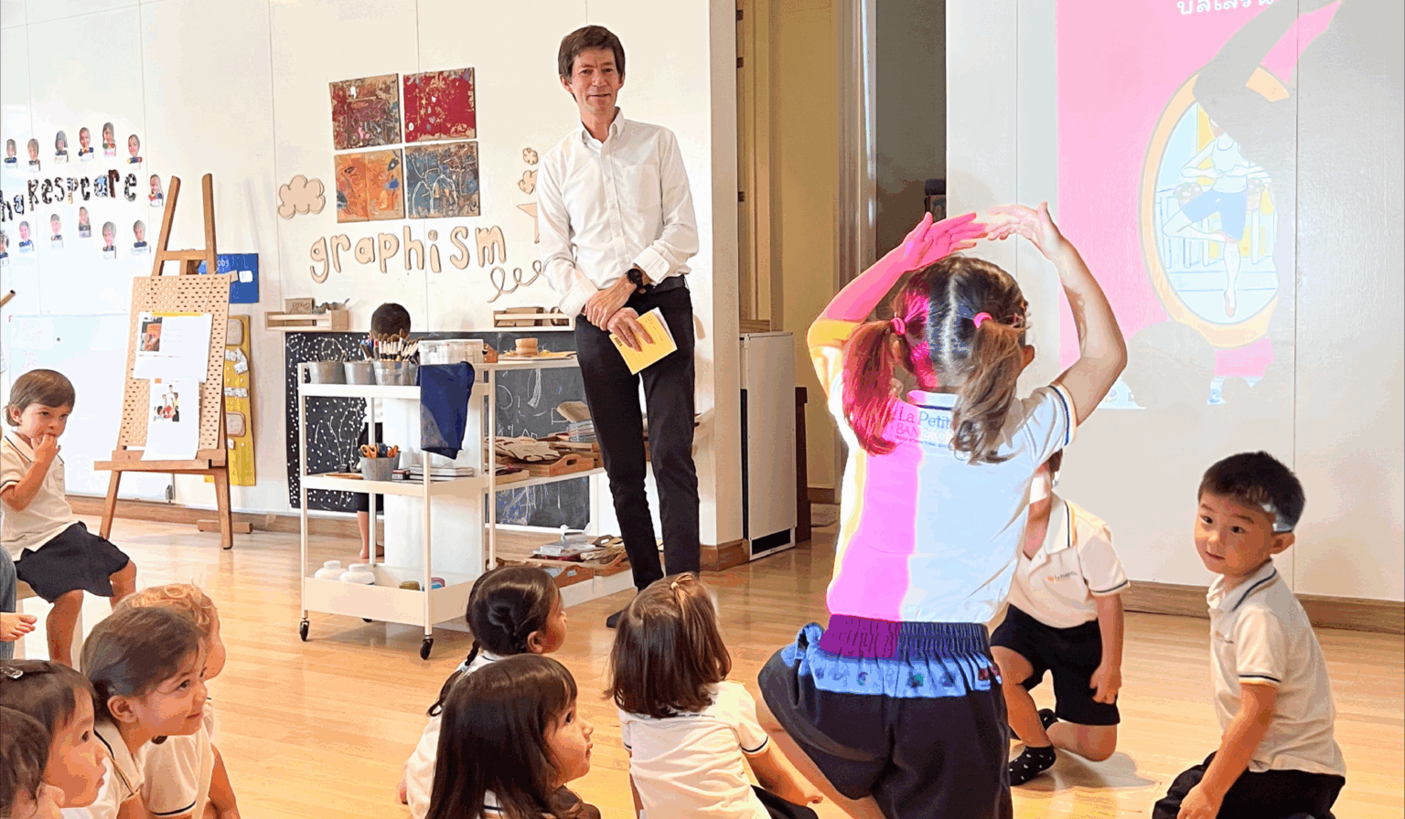 Le 16 octobre dernier, les enfants de Grandes, Moyennes et Petites sections (PS-MS-GS) ont eu la chance d’avoir la visite très spéciale de l’auteur Jean Maury ainsi que de l’illustrateur, Boris Aravindabalan, aka “Sketchman Boris,” qui ont présenté leur nouvelle œuvre bilingue : « Fantômes zinzins ».